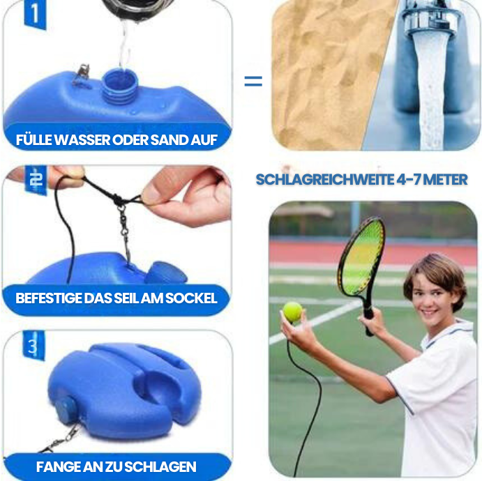 Vergiss die Zeiten, in denen du auf einen Trainingspartner angewiesen warst. Der SoloTennismate ist immer bereit, dir zur Seite zu stehen – unabhängig von Zeit und Ort. Ausgestattet mit einem stabilen Sockel, der mit Sand oder Wasser gefüllt werden kann, und einem hochwertigen elastischen Seil, das den Ball nach jedem Schlag zu dir zurückbringt, bietet dir dieser Trainer die Freiheit, dein Spiel jederzeit zu perfektionieren.☀️